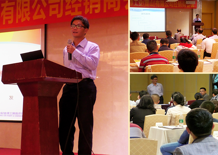 營二部陳立平經(jīng)理作‘水性內(nèi)外墻涂料’報告,針對新開發(fā)的內(nèi)外墻系列產(chǎn)品作了現(xiàn)場說明。